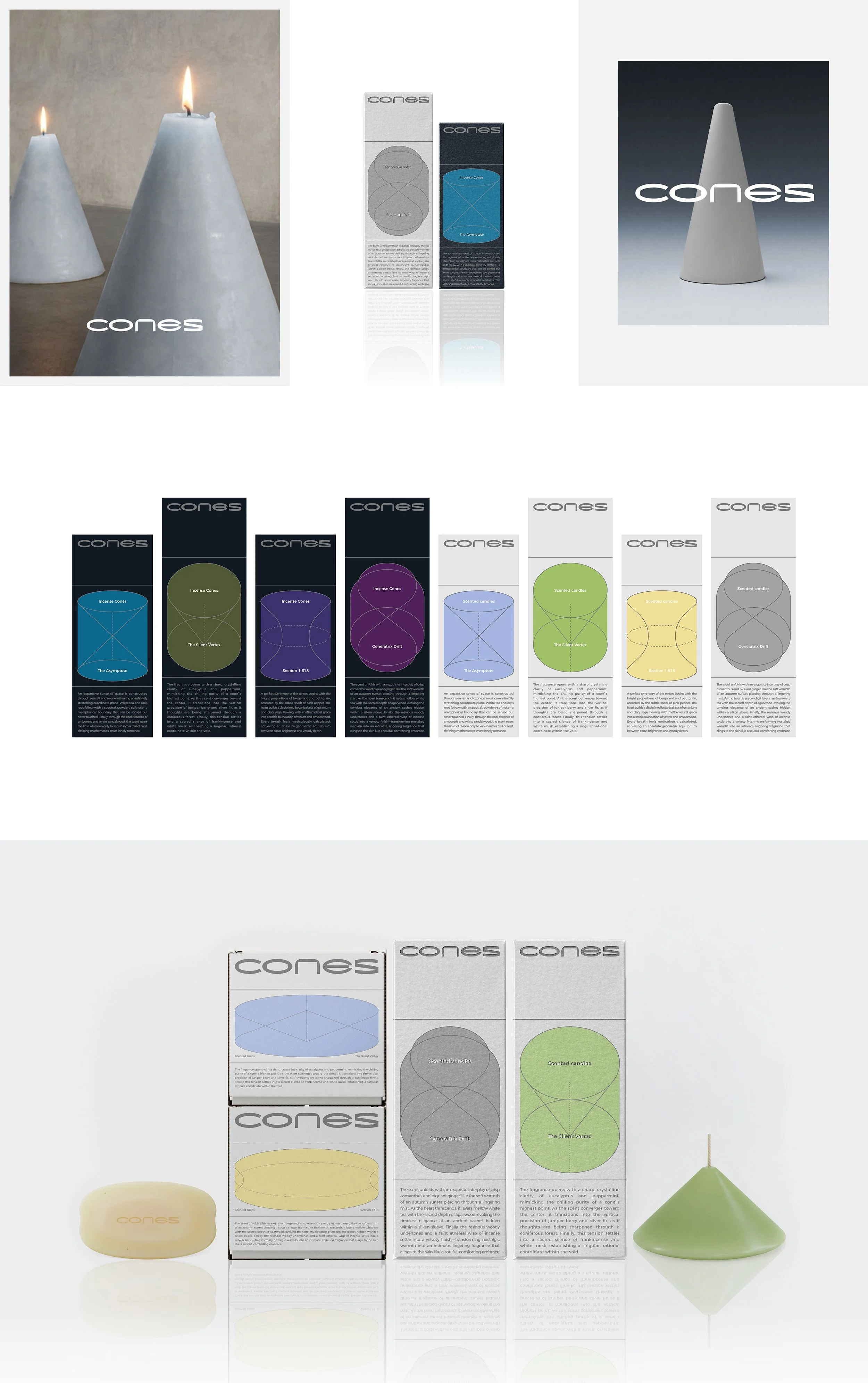 Aesthetics through precision, not chaos. "CONES" where points meet circles in a shift of dimensions. Converting abstract formulas into scented proportions—a rational architecture for a sensory soul.
