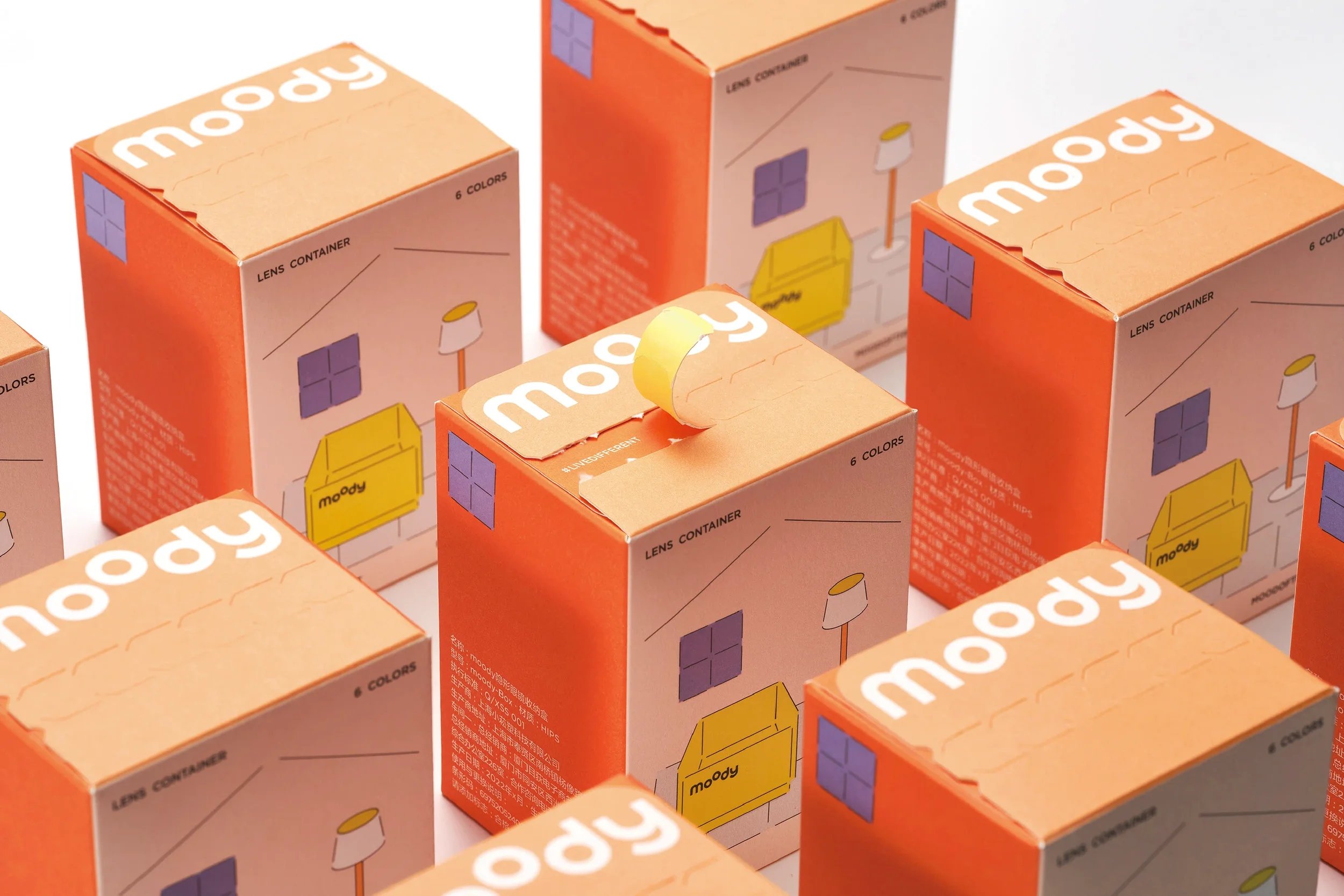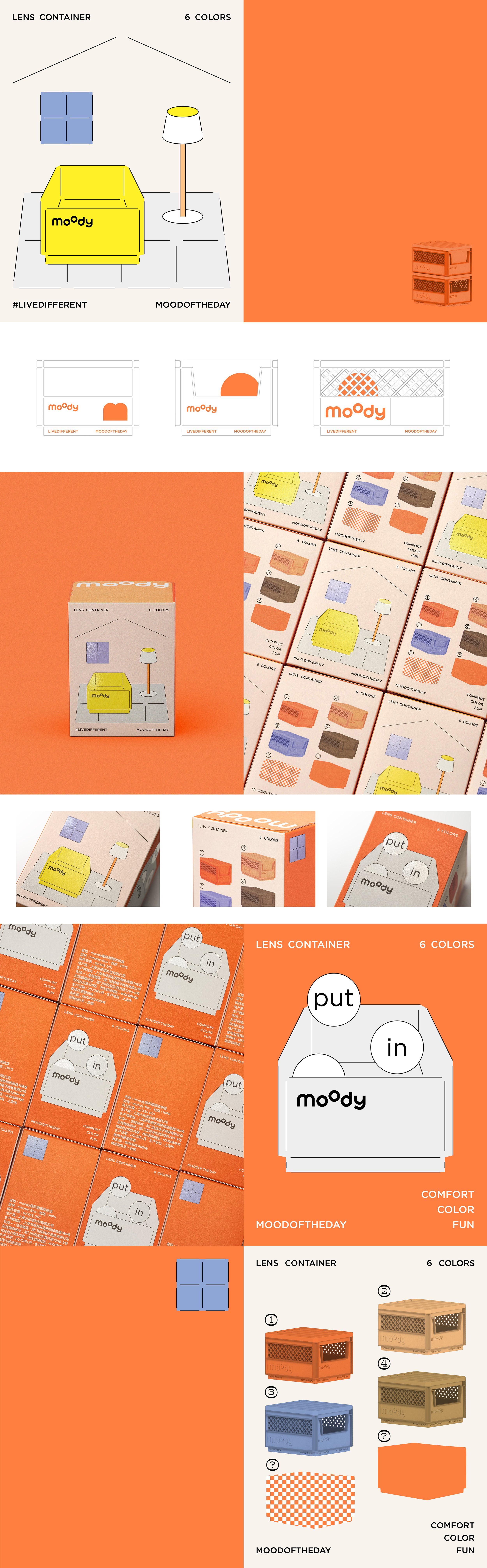 近視患者幾乎每天都會使用到隱形眼鏡,美瞳更是在此群體裡重要的日常用品,如何收整如何在拿取之處能不消耗空間是首要設計條件,其次則是面對攜帶上的便利性。容器開發的階段便秉持著“日常卻不平常”的品牌精神,圍繞著生活物件發想,紙箱、貨櫃、菜籃...等,在此之中希望給用戶有趣的收納體驗。